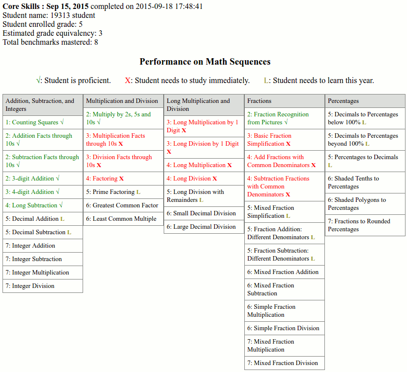 Anything in red font shows an urgent weakness, which is based on the student's registered grade level. The approximate grade level of each skill is listed as a number on the left side of each skill description.